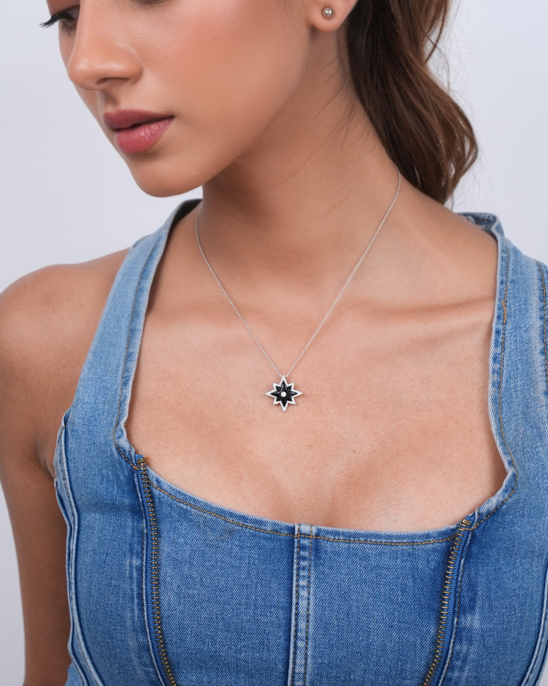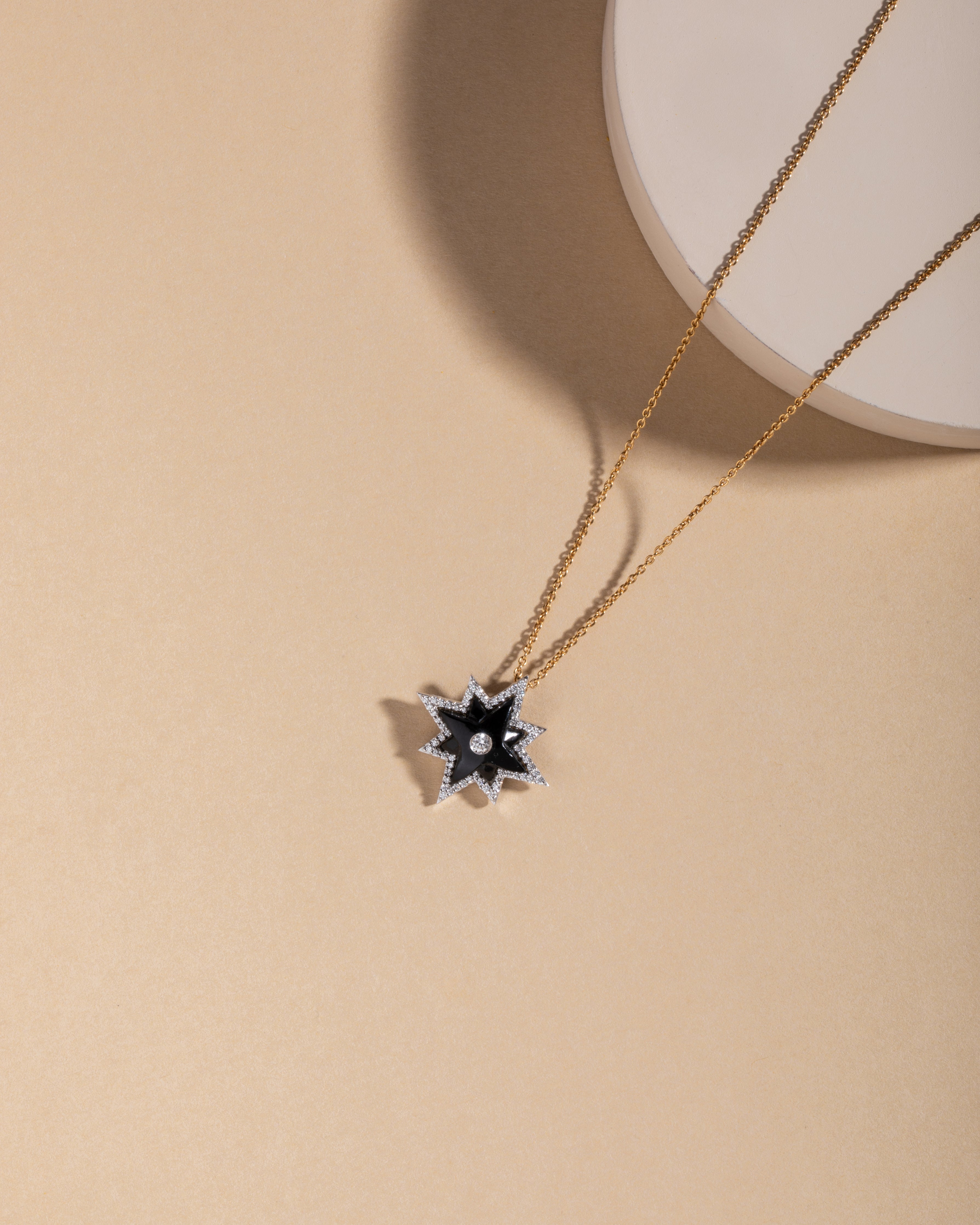 Our Starburst Pendant Necklace is a celestial masterpiece that highlights the allure of the Black Onyx Stone for all its natural beauty. This captivating necklace is more than just a piece of jewelry; it's a representation of the sky’s ethereal beauty, now yours to wear and cherish. At the heart of this necklace lies a stunning black onyx stone, meticulously carved into a radiant star shape adorned with natural radiating diamonds, reminiscent of a guiding star that lights up."