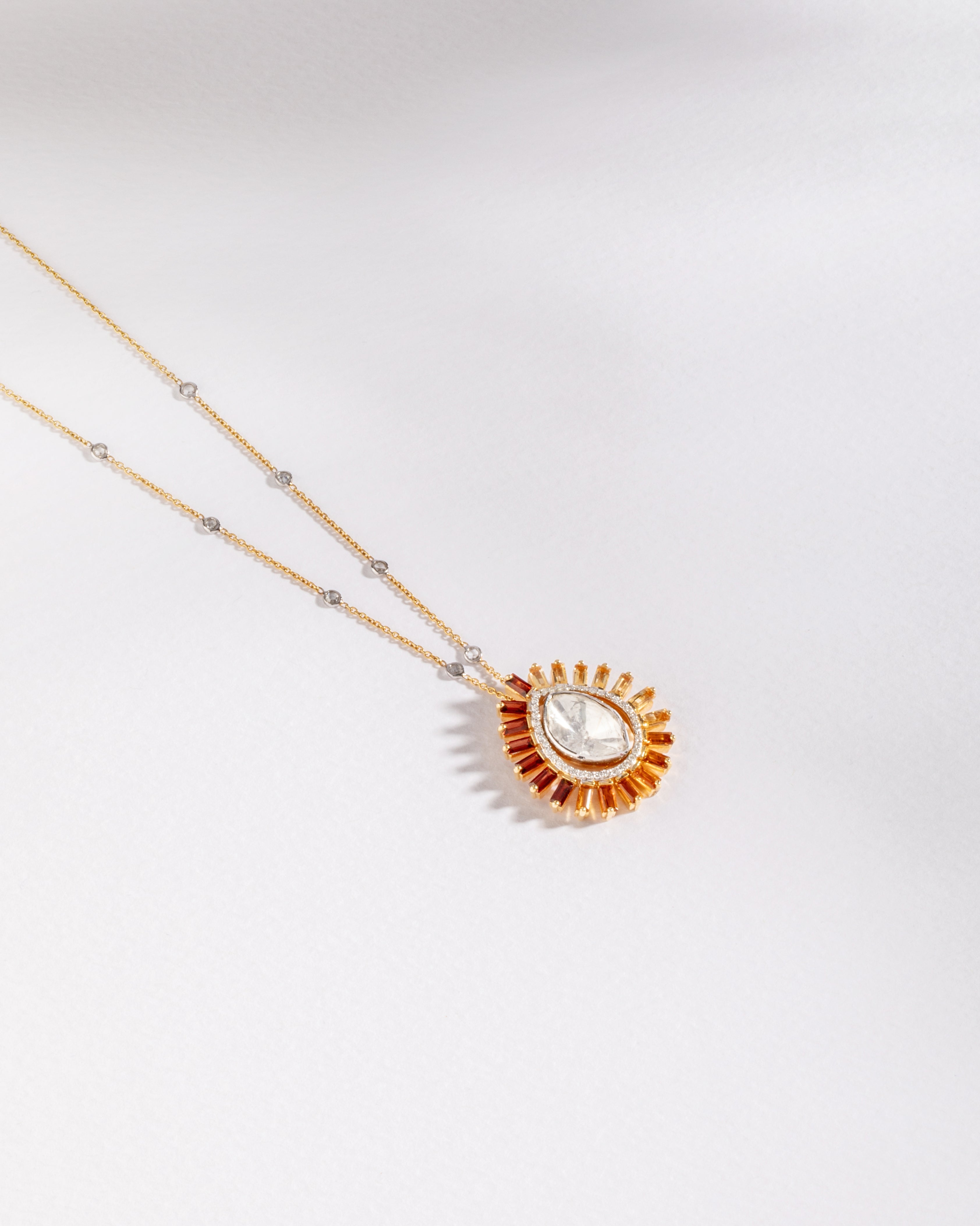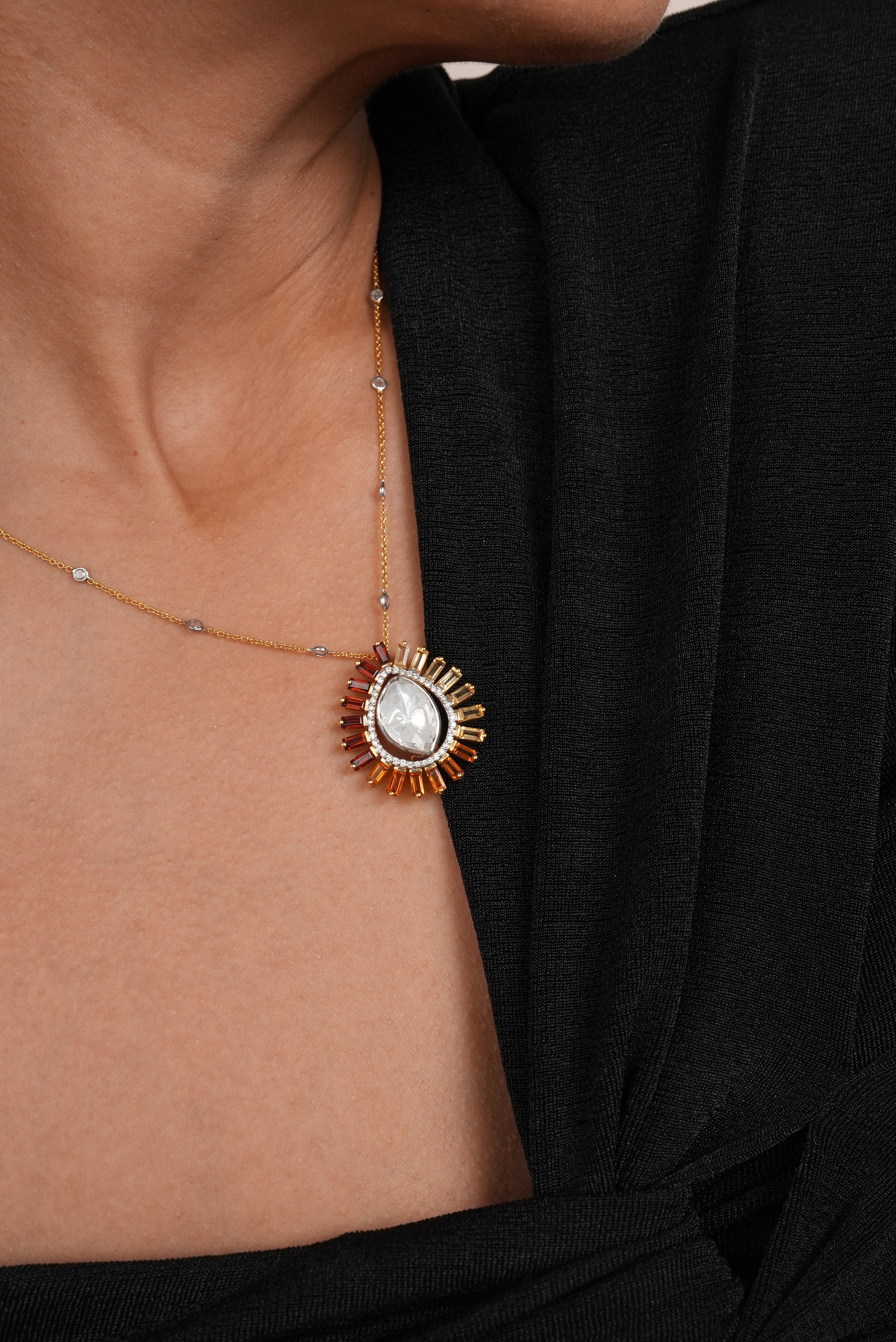 Indulge in everyday beauty with our Citrine Polki and Diamond Necklace, one that can bring vibrant versatility to any look from Western wear to Indian with its alluring Coloured gemstone and single spotlight Polki drop!"