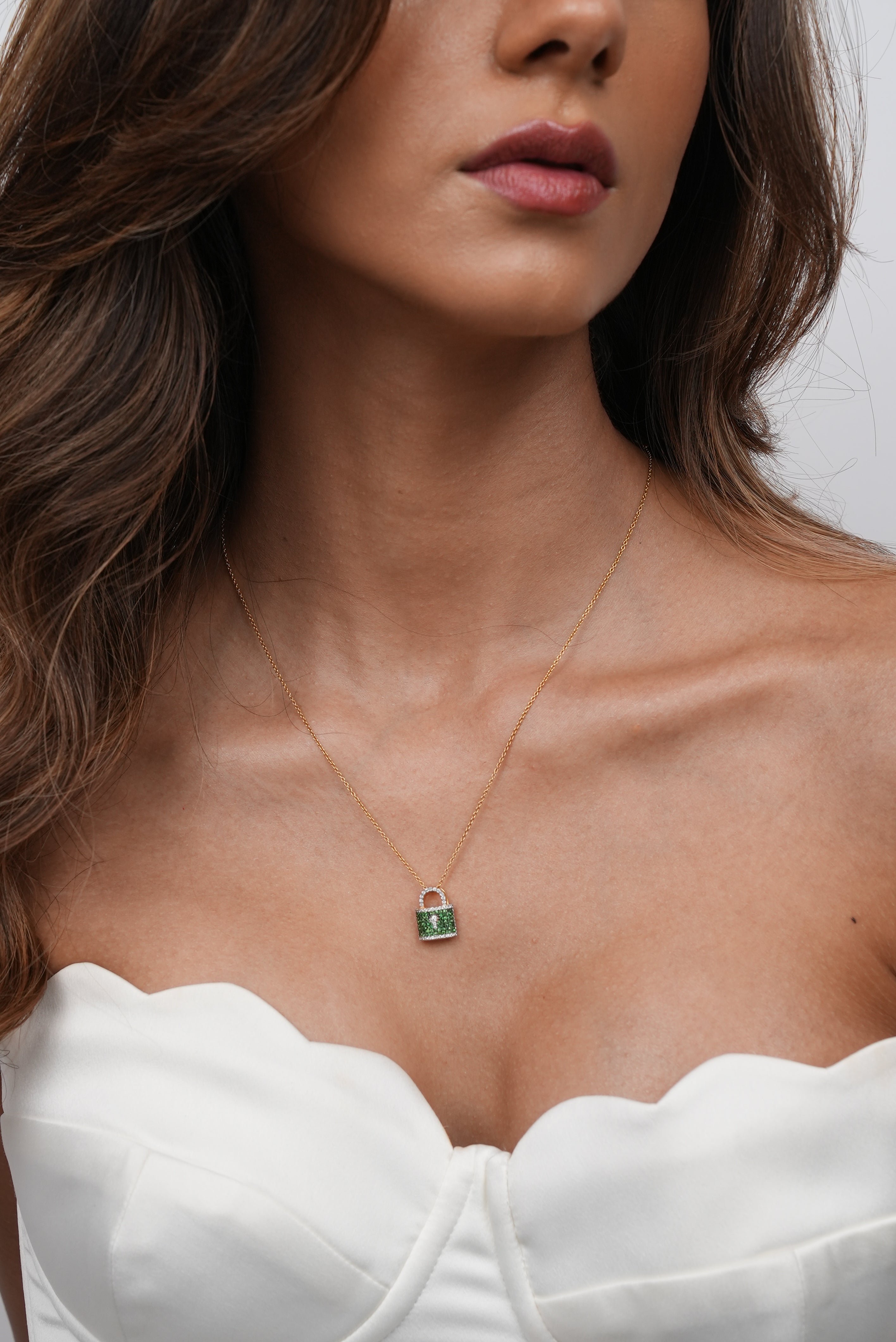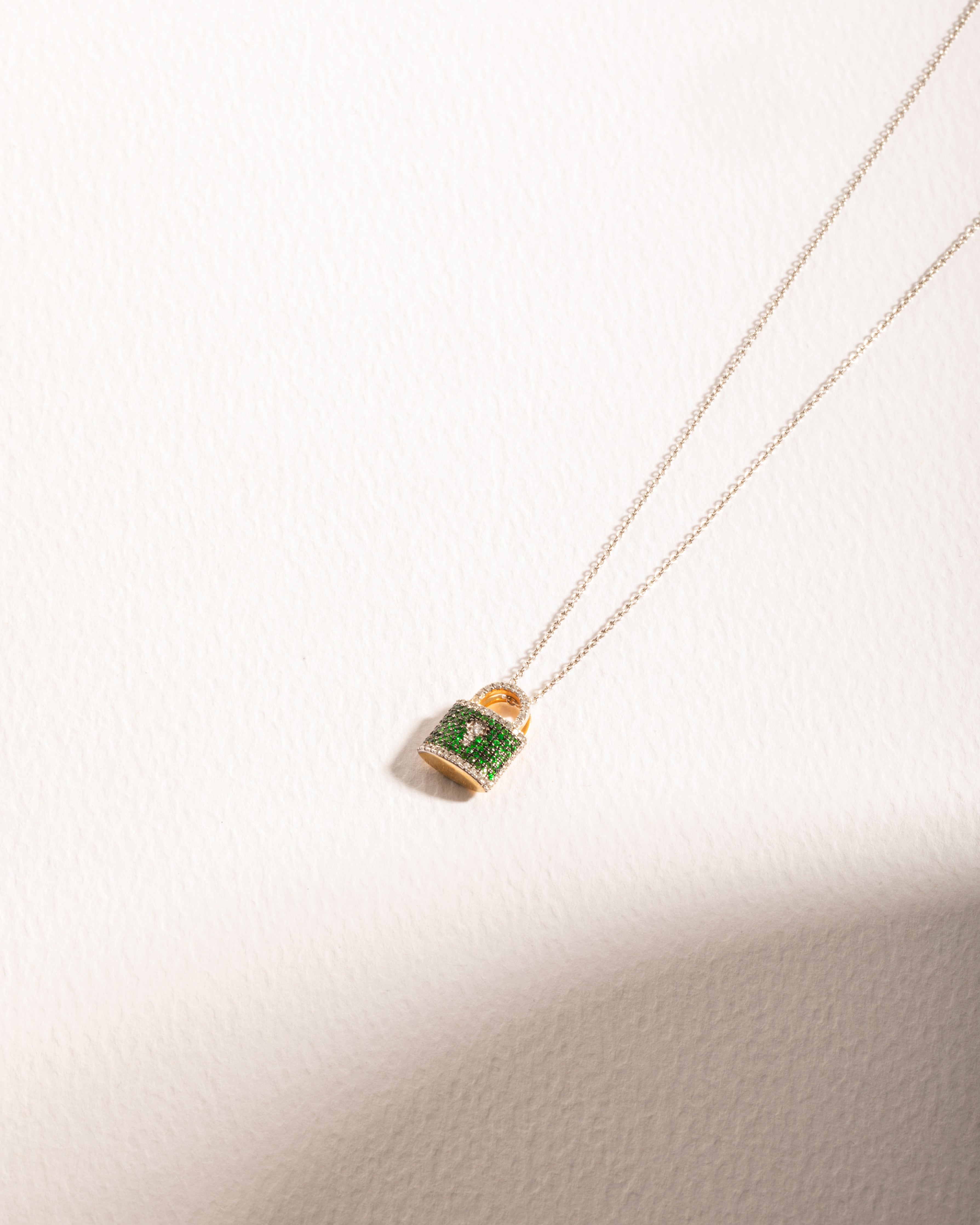 A delicate finesse that makes a bold statement, our Green Tsavorite and Diamond Lock adds the perfect touch of color to your neck. Transition with your lock piece seamlessly from day to night with any look you pair it with.