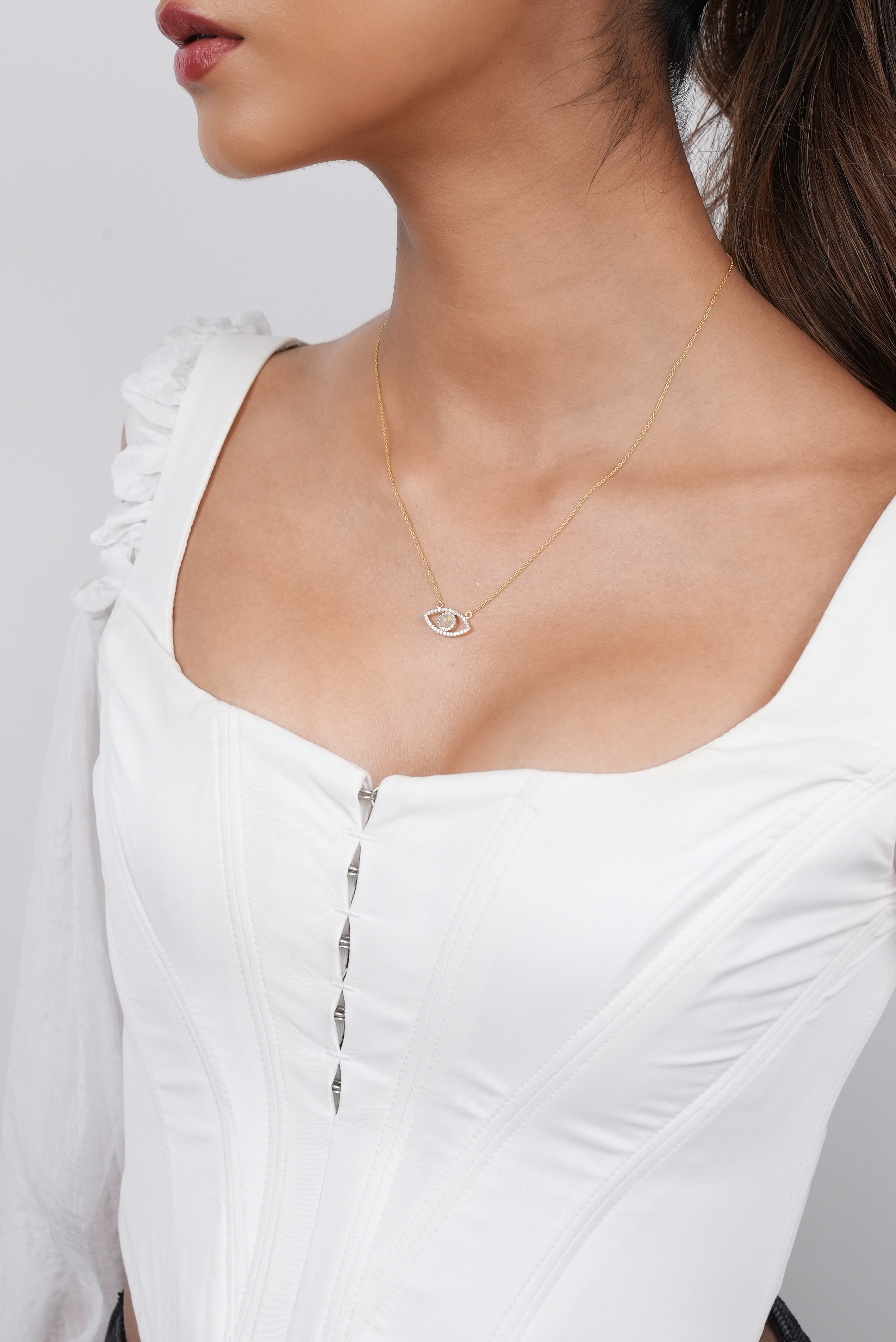 The protective evil eye takes on the enchanging beauty of natural opals, creating a piece of jewelry that will keep you at calm and bring you joy everyday. Layer it with our other charms or wear it as a statement accessory piece for protection.