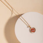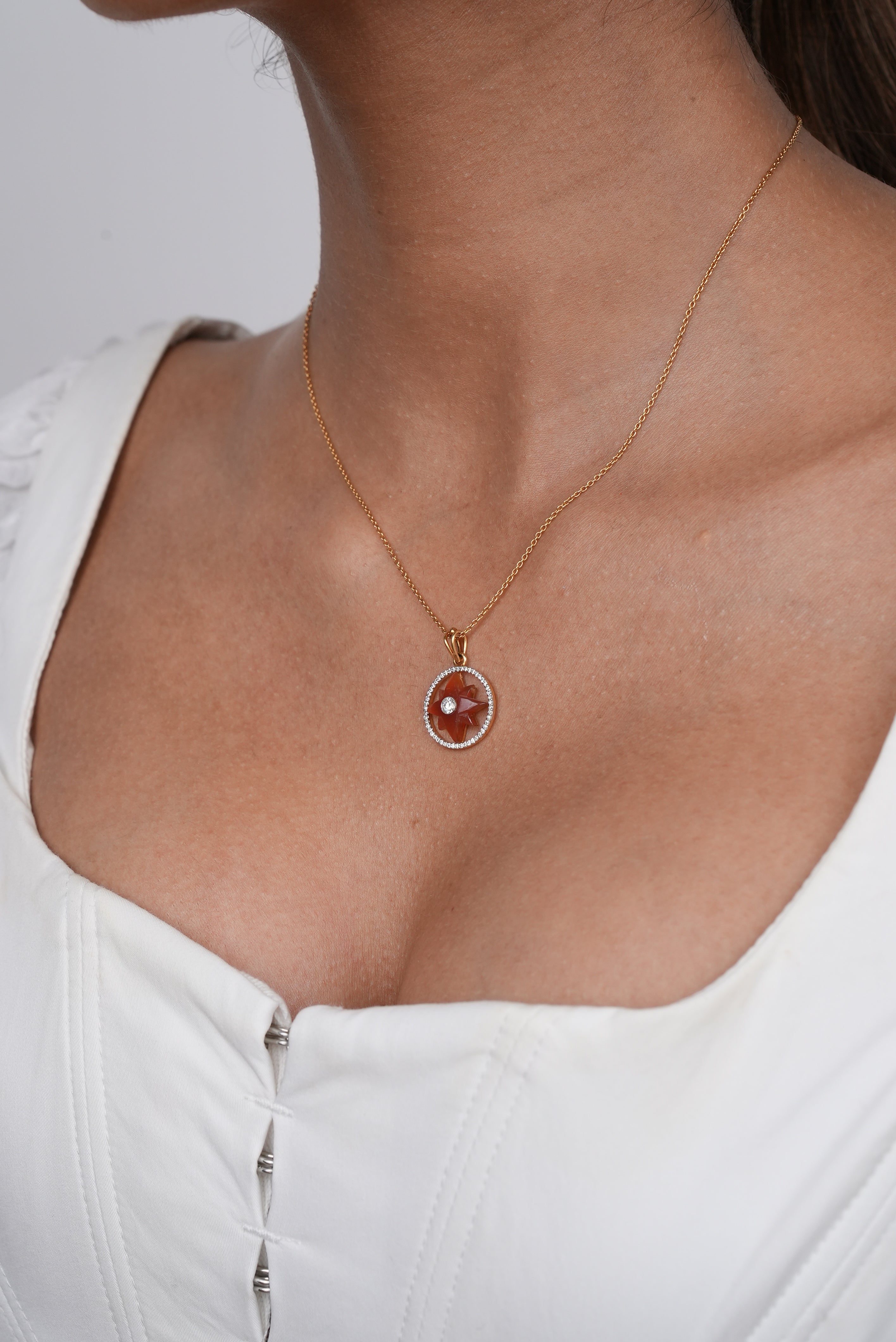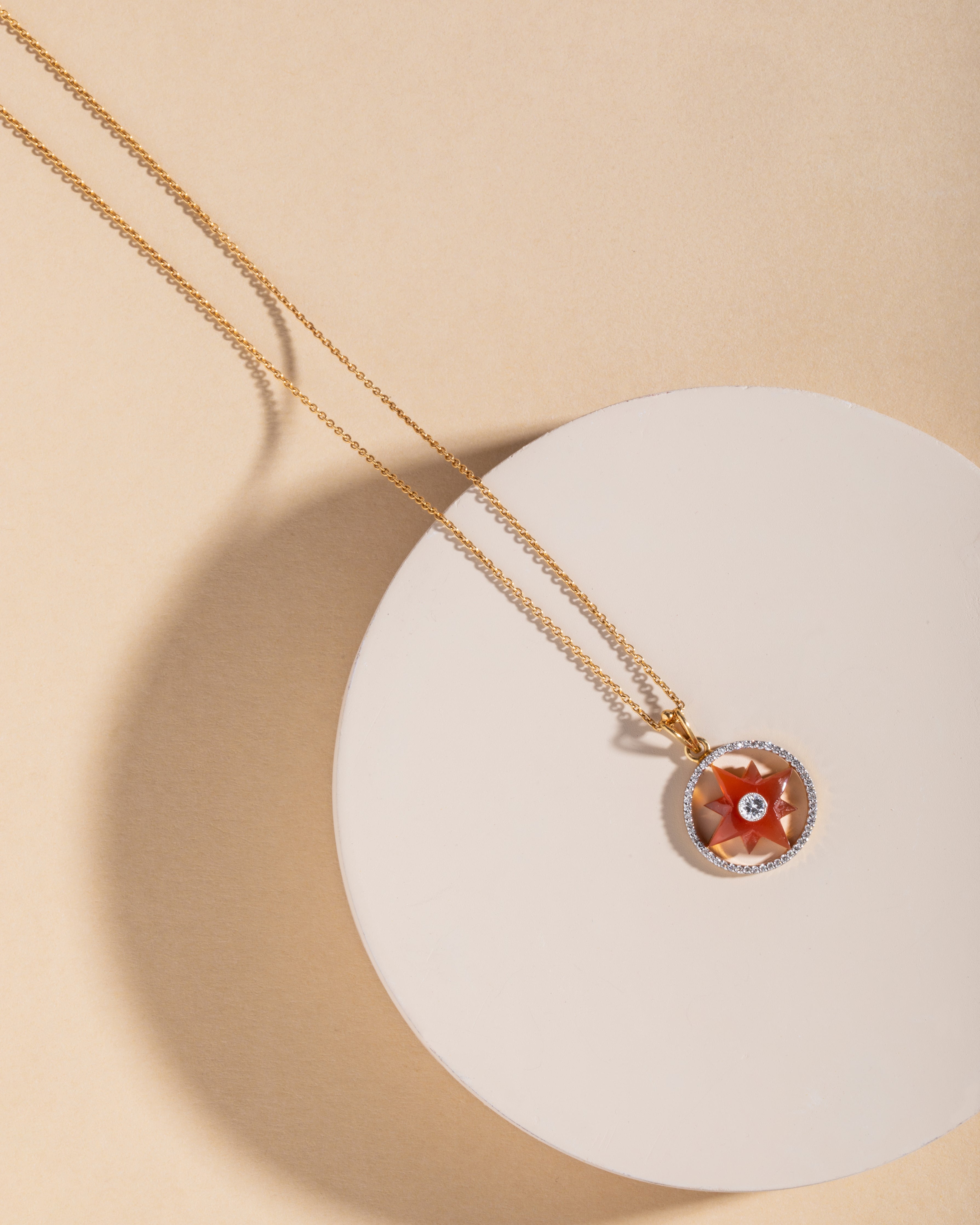 Our Star Pendant Necklace is a celestial masterpiece that blends the allure of Orange Chalcedony with the timeless elegance of diamonds. This captivating necklace is more than just a piece of jewelry; it's a representation of the sky’s ethereal beauty, now yours to wear and cherish. At the heart of this necklace lies a stunning Orange Chalcedony pendant, meticulously carved into a radiant star shape adorned with natural radiating diamonds, reminiscent of a guiding star that lights up."