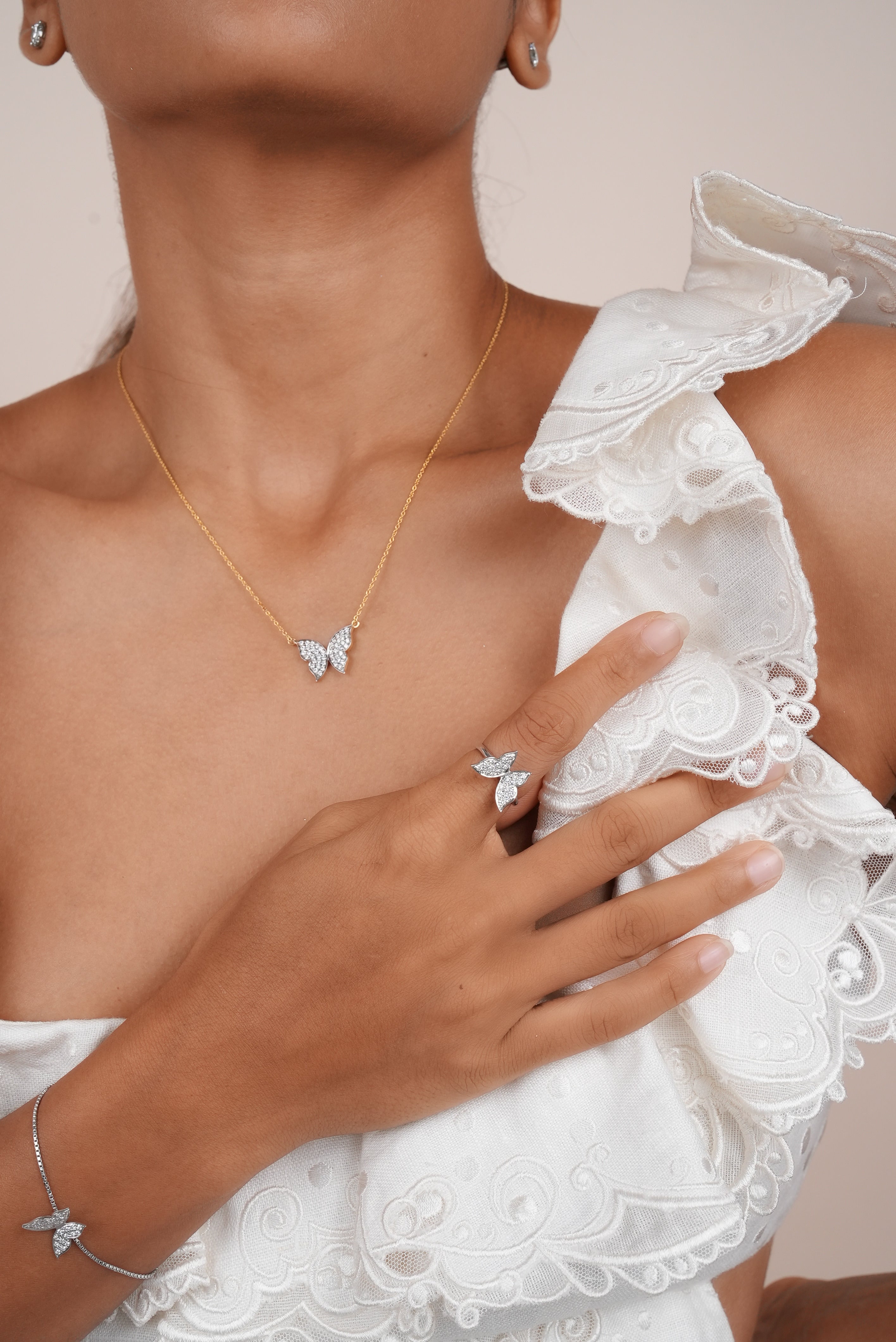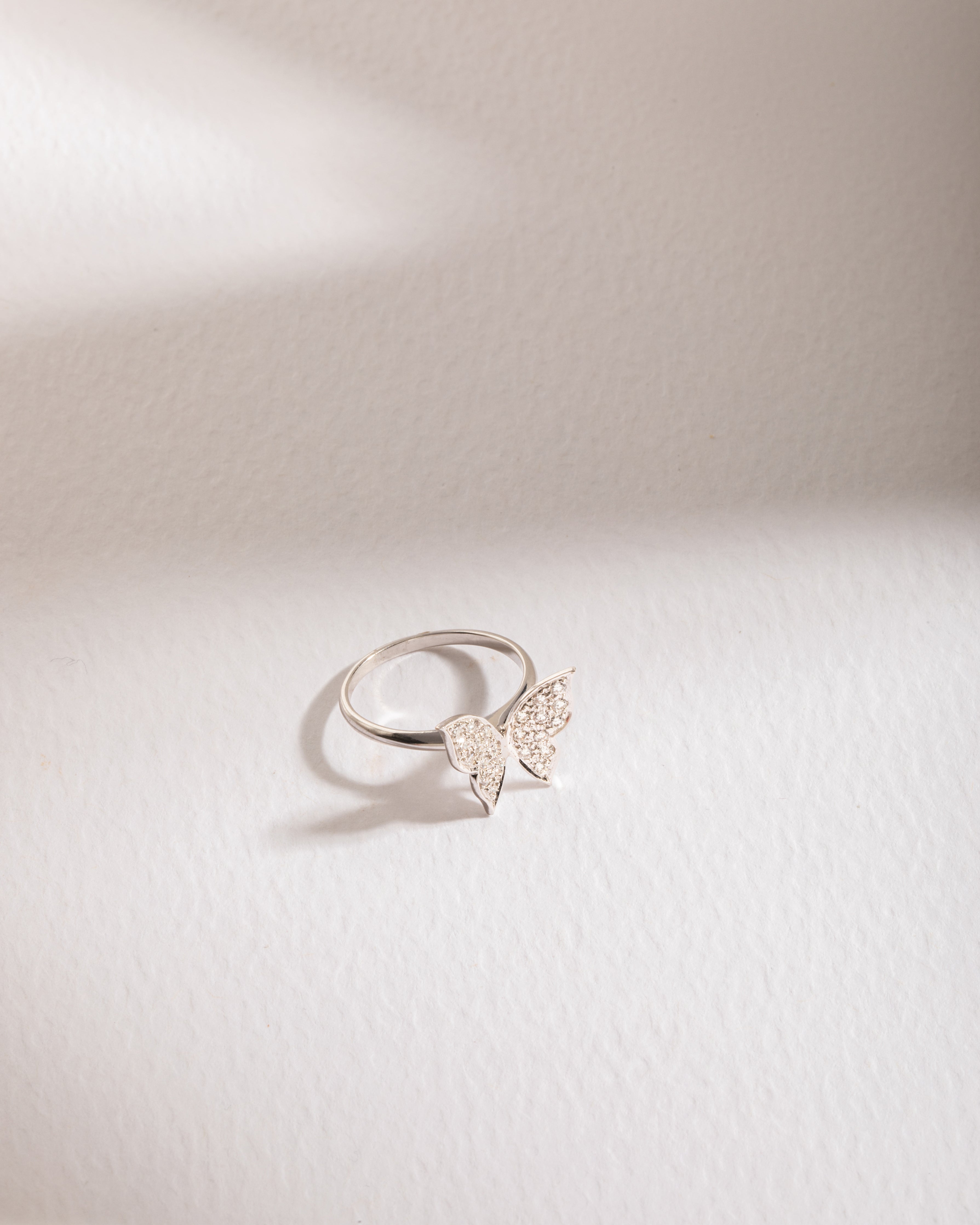 Our beautiful Papillon ring encrusted in diamonds is truly a natural beauty. Crafted with utmost precision, this ring is shaped and textured to mirror the intricate patterns found in the silhouette of a butterfly.
