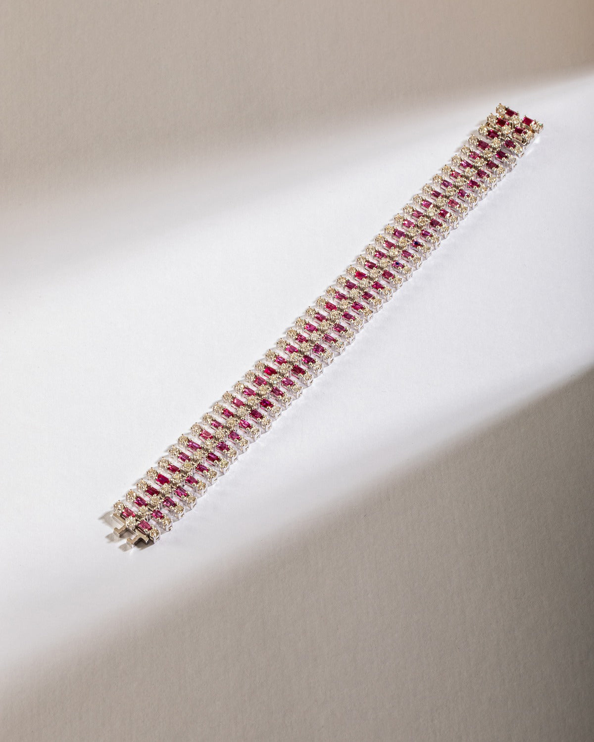 Mozambique rubies and diamond baguettes meet in a flawless line of fire and brilliance."