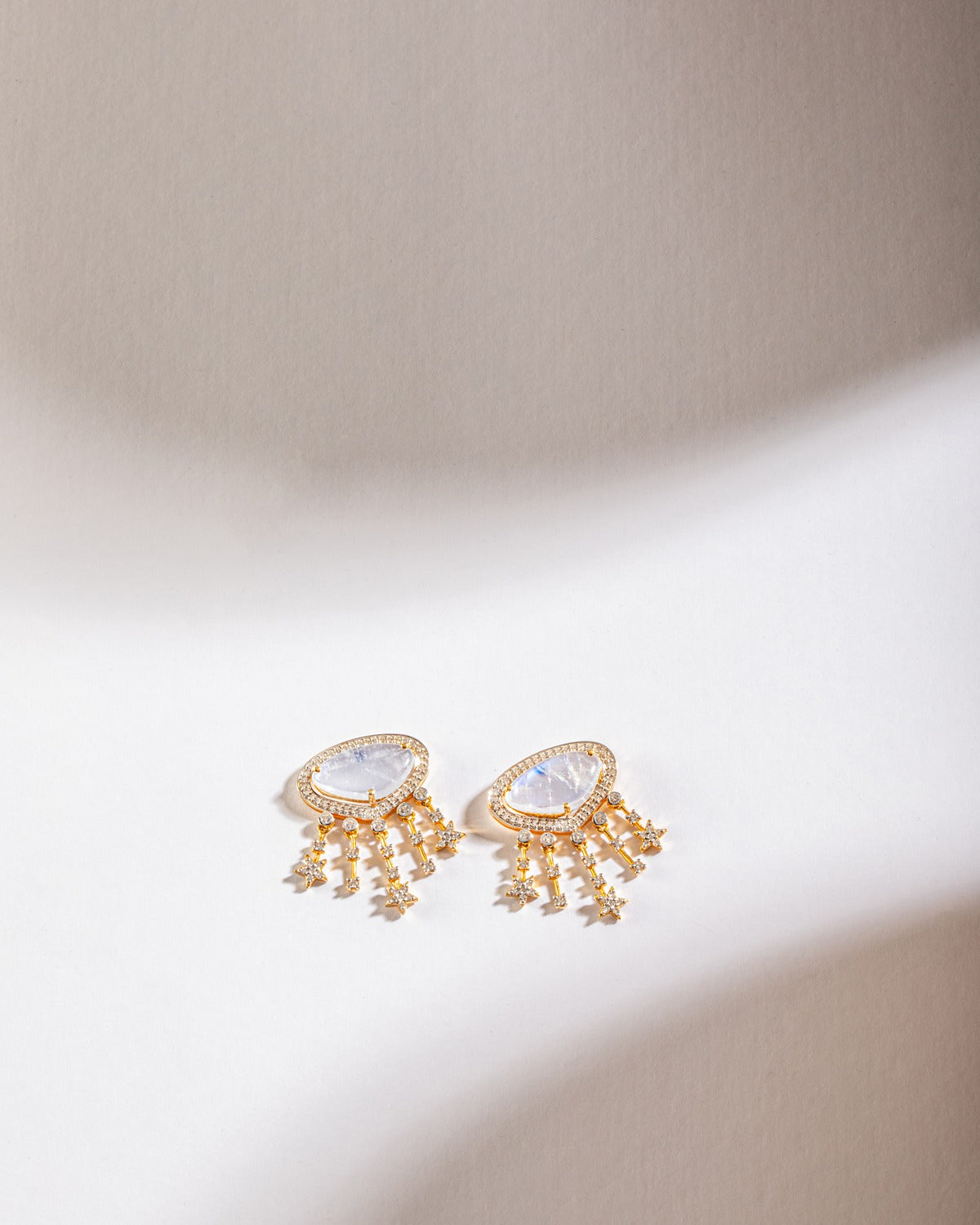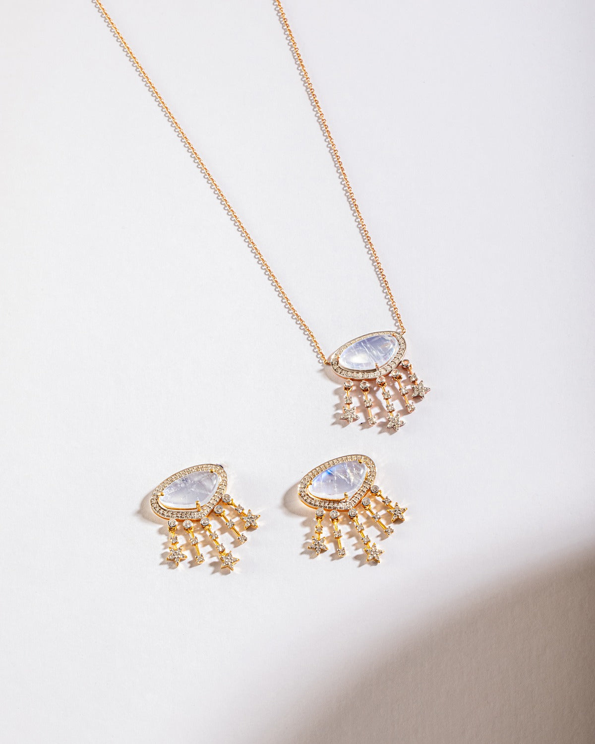 Introducing our Blue Moonstone and Diamond Earrings, inspired by the enchanting cosmos. This exquisite piece features a luminous blue moonstone, reminiscent of a serene night sky, surrounded by sparkling diamonds that evoke the brilliance of distant stars. Embrace the magic of the universe with this celestial earrings, perfect for adding a touch of cosmic elegance to any ensemble.