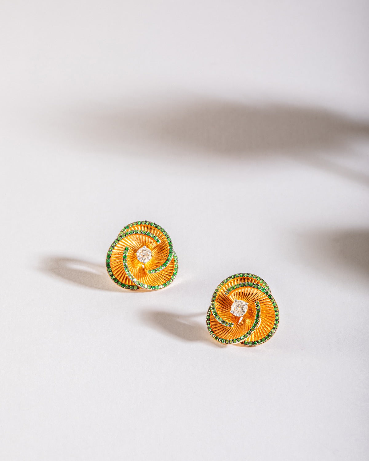 Our beautiful Tsavorite Retro Bloom Earrings have been intricately crafted to represent the blossoming of flowers. Edged with tsavorites and a solitaire at the centre, these earrings emanate confidence and beauty.